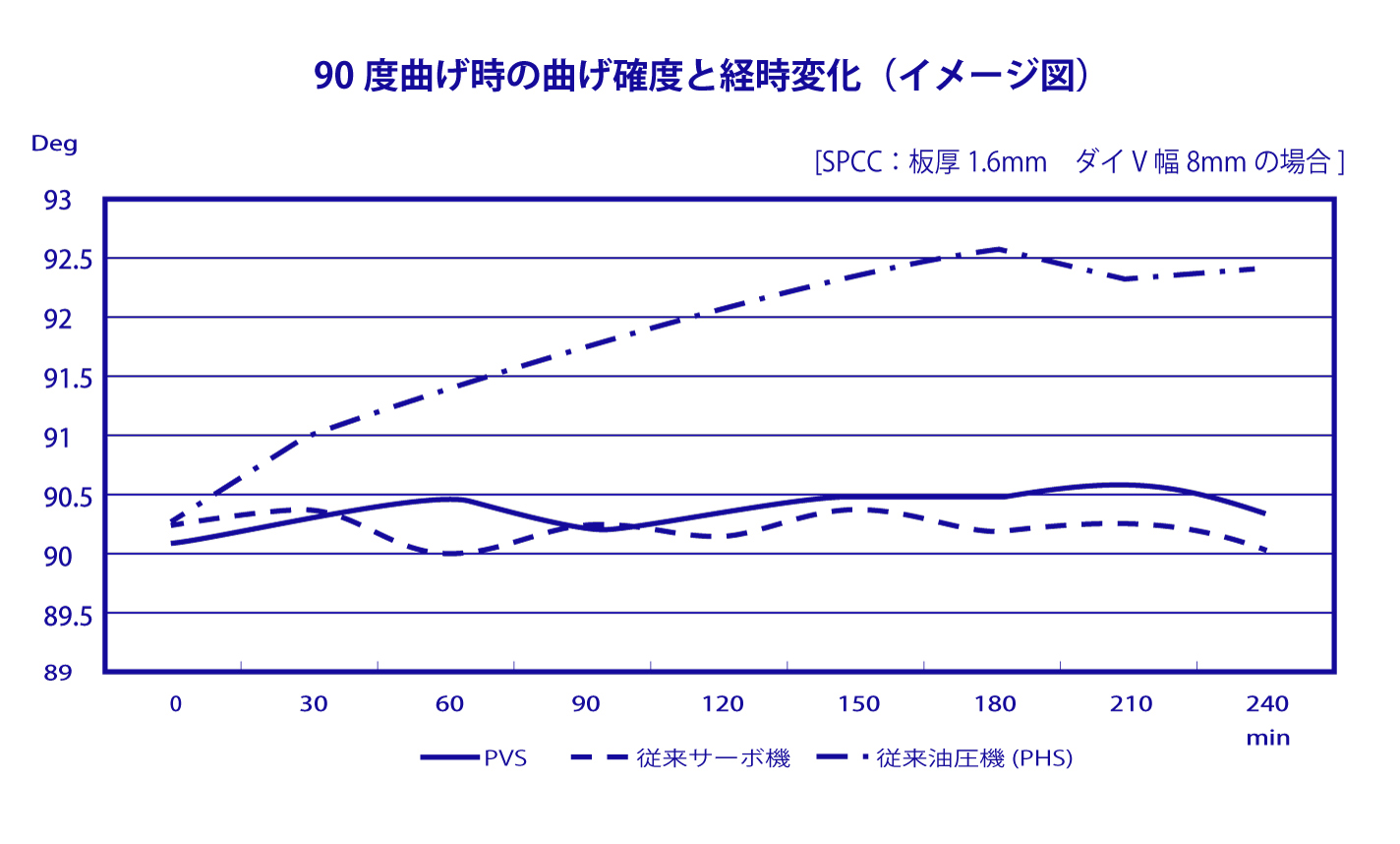 2軸油圧シリンダとACサーボモータのハイブリッド制御*により、PVSシリーズは高精度な位置決めと長期間にわたる安定した繰り返し加工を実現します。高剛性フレームは高負荷の曲げ加工にも対応。アングルコントローラはクサビ分割数の増加で補正をより滑らかにし、高精度な曲げ角度制御を可能にします。さらに、サイドフレームから独立したリニアスケールでラム位置を検出するため、曲げ荷重の影響を受けず、正確な位置決めが行えます。これにより精度要求の高い加工でも、安定した高品質な仕上がりを提供します。