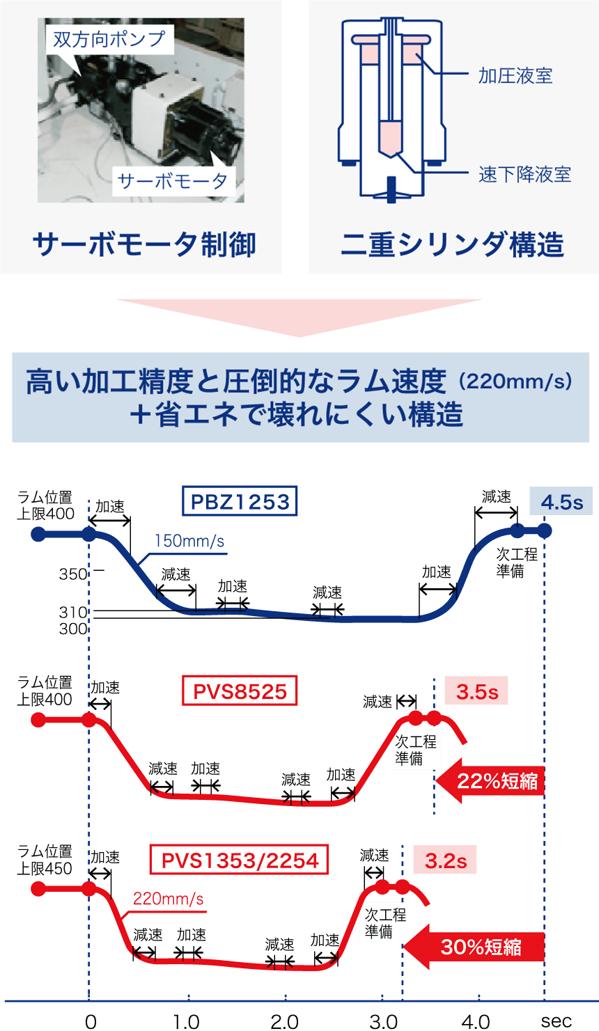PVSシリーズは最大ラム速度220mm/sを実現。サーボモータ制御と二重シリンダ構造により、業界トップクラスの曲げ下降速度を提供します。左右に独立配置されたサーボモータ(双方向ポンプ)が高い追従性を発揮し、シリンダ内の速下降専用液室により従来機比でサイクルタイムを最大30%短縮。この高速加工によって、生産ラインのスループット向上とコスト削減に貢献します。