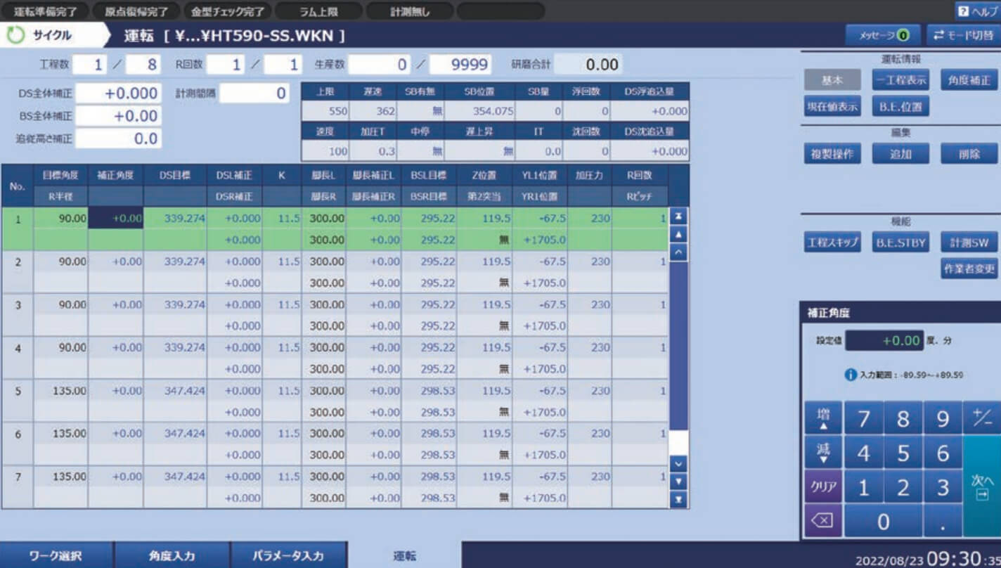 コマツ産機のプレスブレーキは21.5インチの大型ディスプレイを搭載し、ユーザー目線で設計された直感的なアイコンやボタン配置により操作が簡単です。大型テンキーにより素早く入力でき、ミス操作を減少させます。また、新フートスタンドは手動パルサを使いやすい位置に配置。これらの機能により、訓練負担が軽減され、効率的に操作を習得できます。