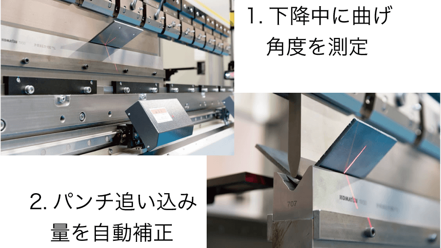 ベンディングアイは、レーザ式非接触曲げ角度センサーを使い、曲げ角度を自動補正します。これにより、補正時間を短縮し、安定した加工が可能になります。