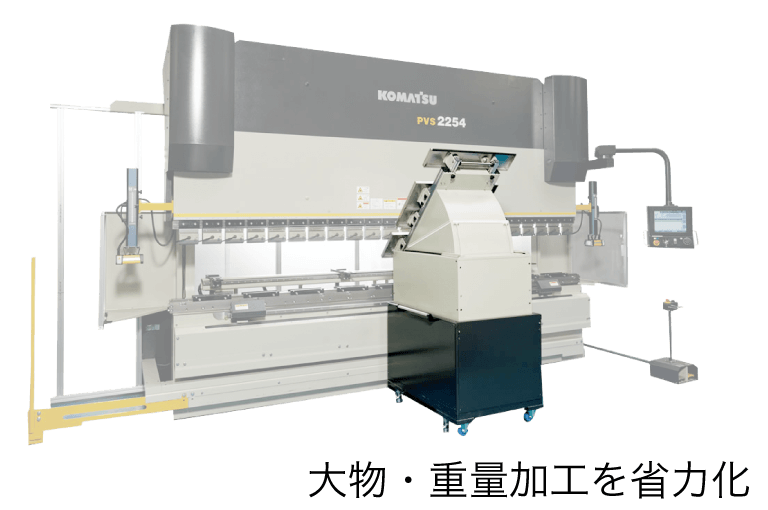 ベンディングサポートは、薄板大物や重量ワークの曲げ加工を補助します。これにより、省力化し、大物加工時の生産効率を大きく向上させます。